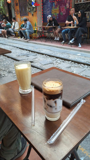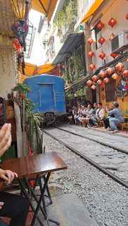 We wandered around some more, and we came upon "Train Street". This is quite a famous tourist attraction as it is a residential and working area that has trains passing right through it, and you can sit close to the railway tracks as the train passes you by. We did not know when the trains were due but by this time we where needing a little coffee break, so we took seat in one of the many little cafes along this stretch of railway and not long after we had our drinks (coconut coffee for me and mango smoothie for R), things started to change and we realised that a train was due to come through.